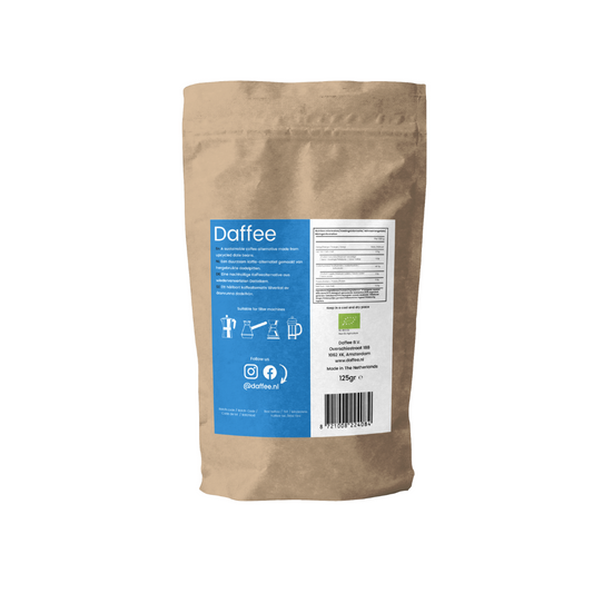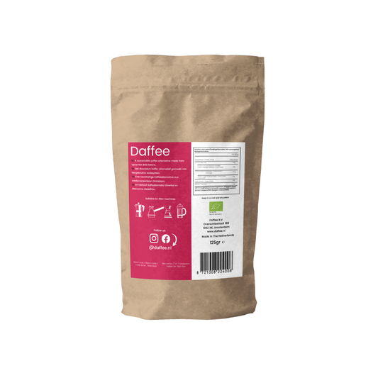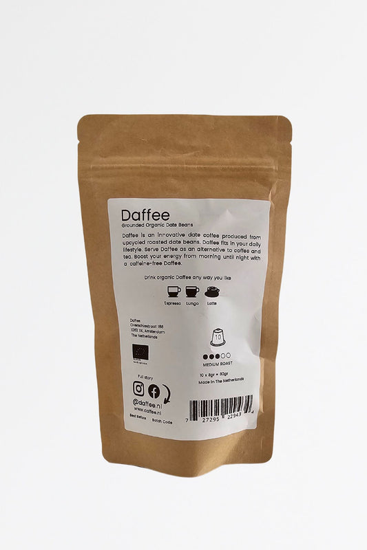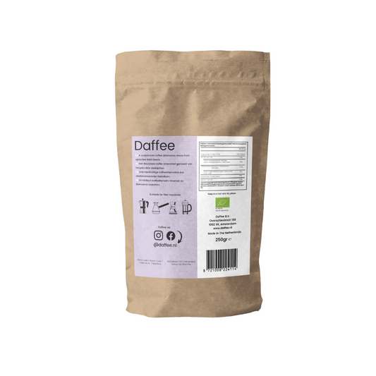 Coffee alternative from organic upcycled date seeds. With sustainable packaging and certified organic ingredients, Daffee is caffeine-free and rich in antioxidants, minerals and, fibers. Embrace goodness in every sip.