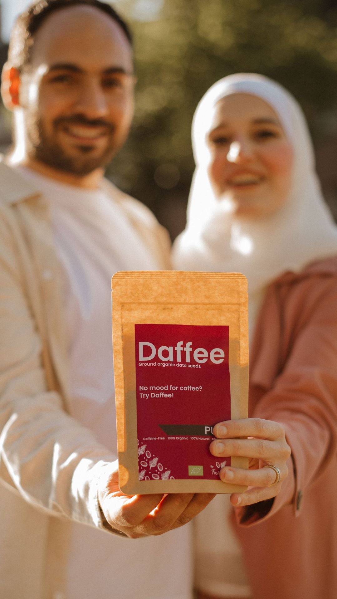 Daffee results from Rahaf's effort during her master's degree in innovation from Santiago de Compostela University. Her eating behaviors her love for date fruits and her awareness about food waste created an opportunity for her future.Our relationship had a special start. We met and got to know each other online, seeing each other only on video calls. Then we got engaged and married, also online, and it took 3 years before we could meet in person for the first time. Guess where we first hugged each other?